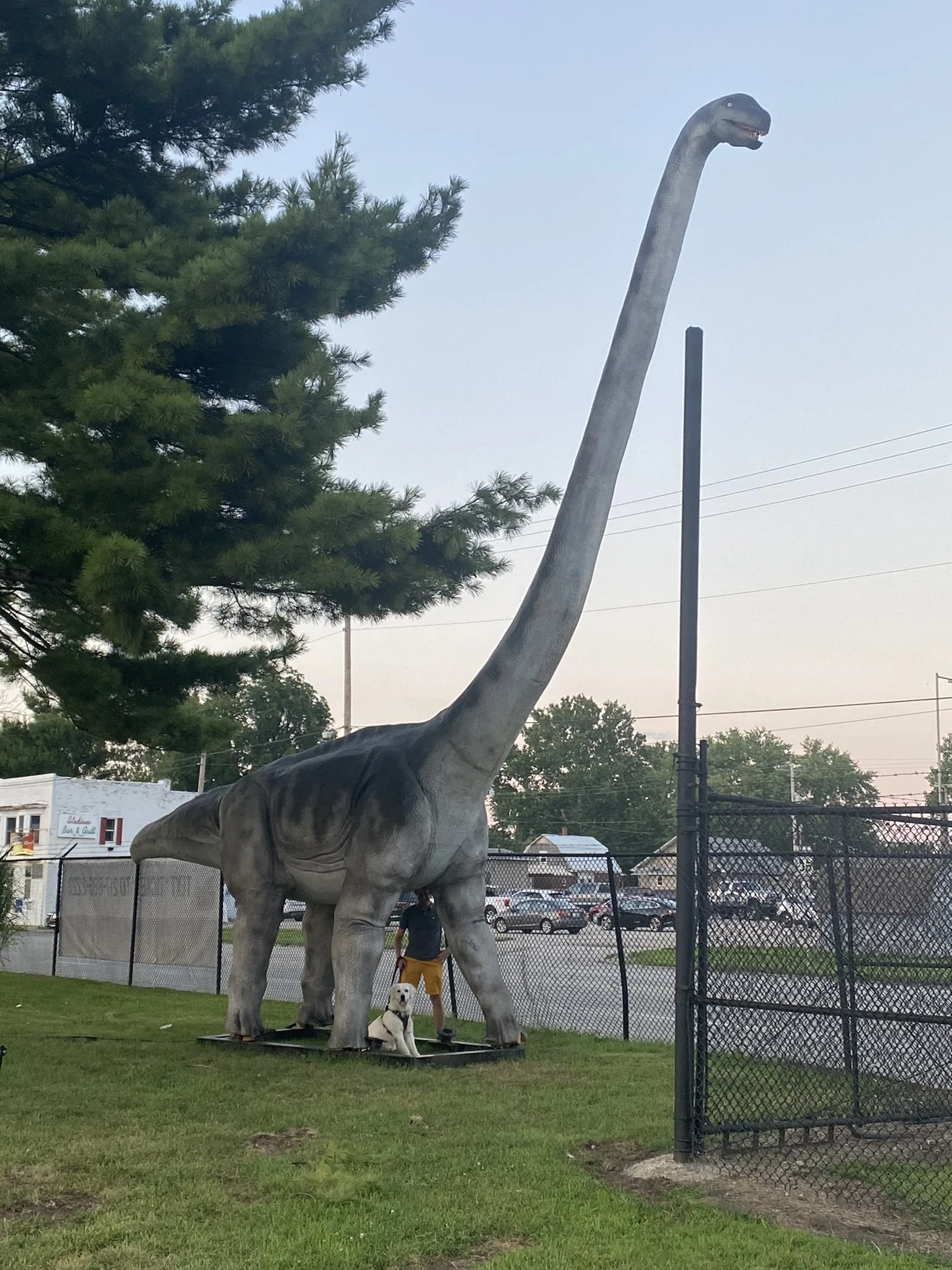 Nico and Bryce posed with a large dinosaur which was put up in preparation for the IL State Fair this year.
