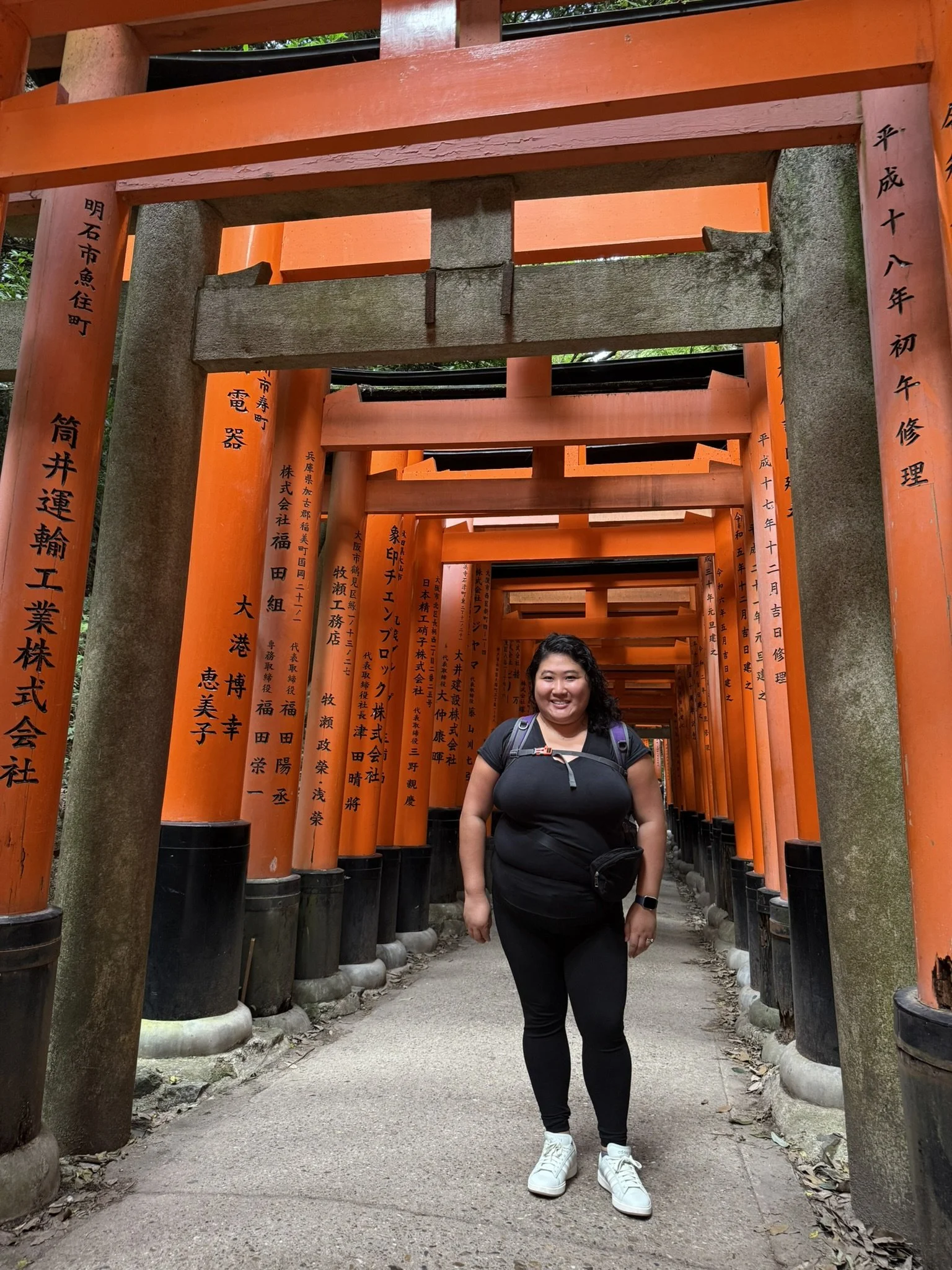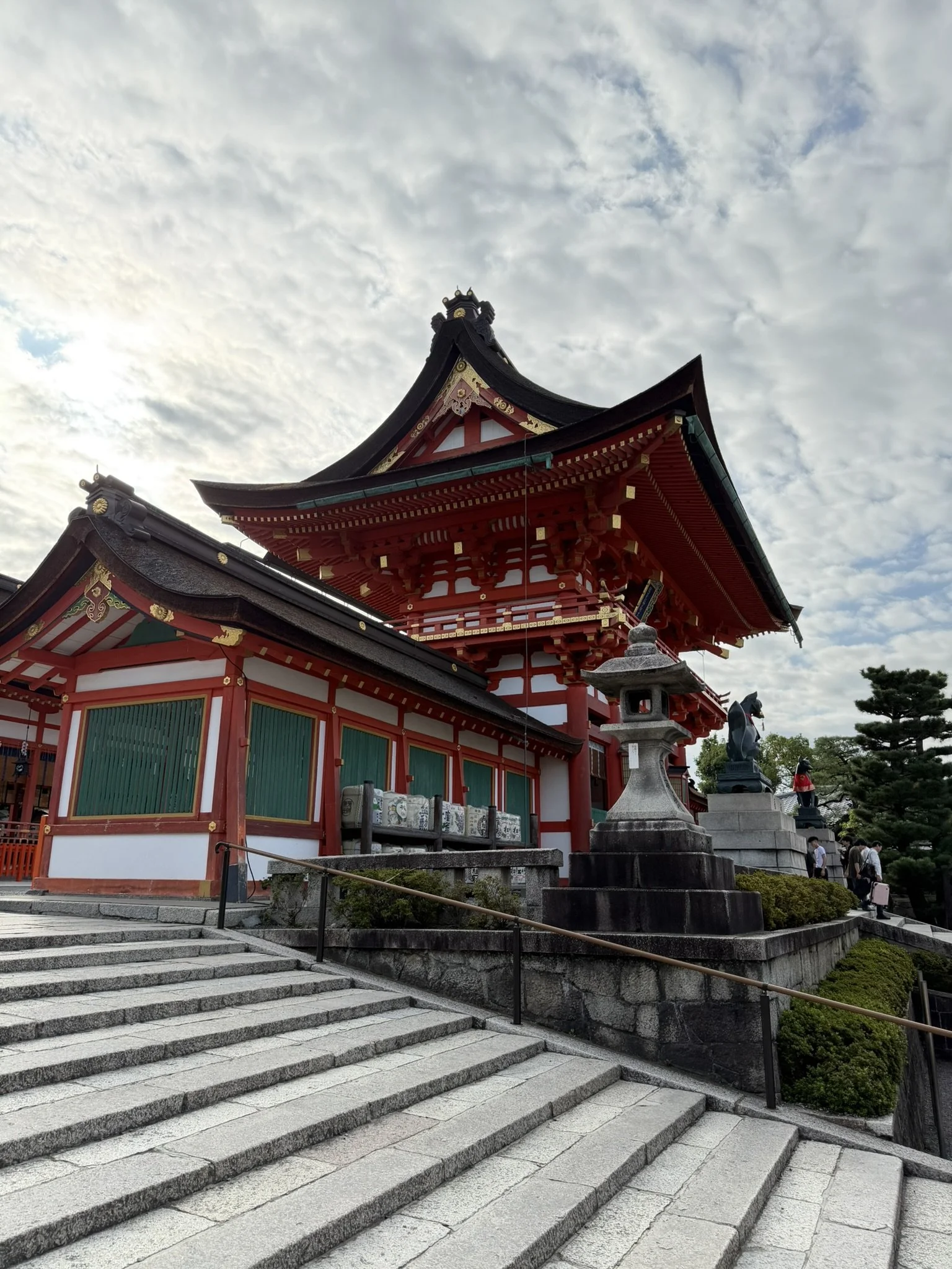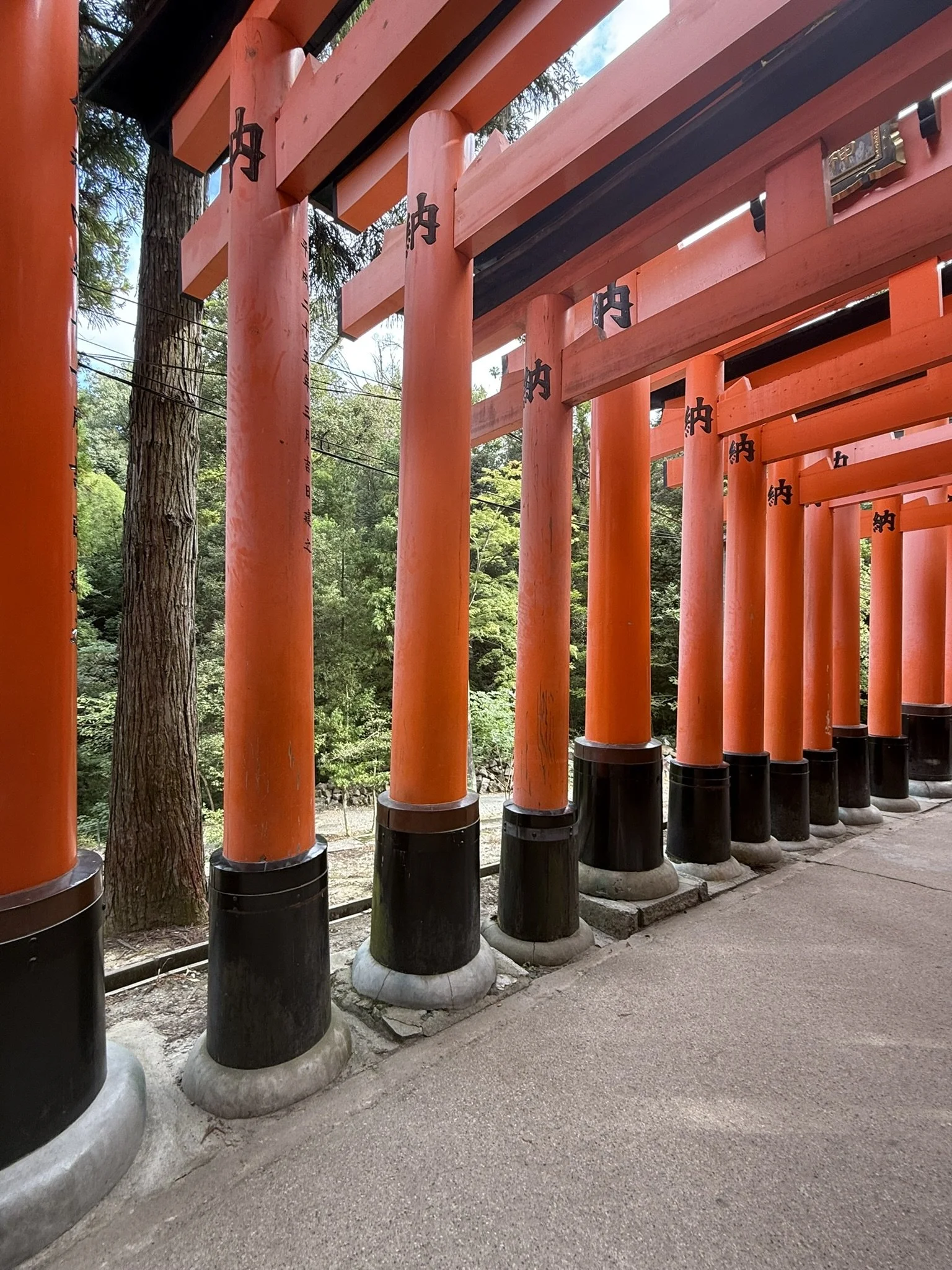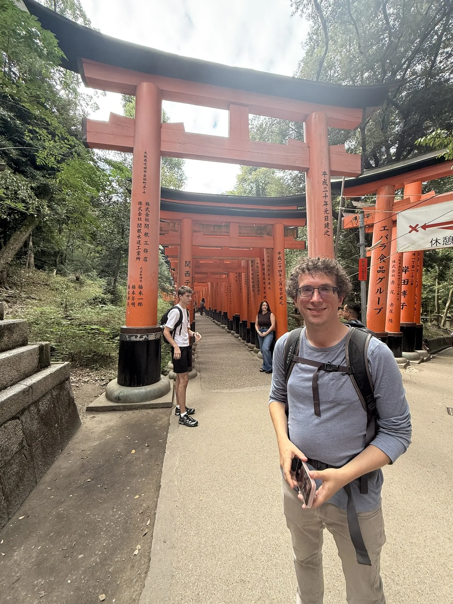 We all stopped at 7-Eleven again for a quick breakfast before heading over to Fushimi Inari Taisha Shrine to see the Senbon Torii. Torii is a Japanese gate that is a symbolic marking of the transition to the sacred. Other countries also use Torii related gates, but the Fushimi Inari Taisha Shrine is known as the “Thousand Torii Gates”. The shrine of the Kami Inari has a trail to the top of the mountain, about a 2.5 mile hike upwards. Kyle and Danielle went up to the top, but Bryce and I strolled many of the Torii gates. While there are around 800 torii gates along the main path, there are many smaller personalized torii engraved by citizens with family members’ names on them. There are also foxes (known as messengers) that line the paths as well.