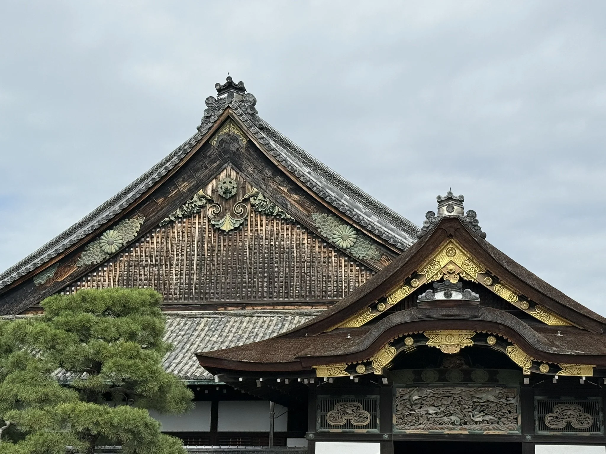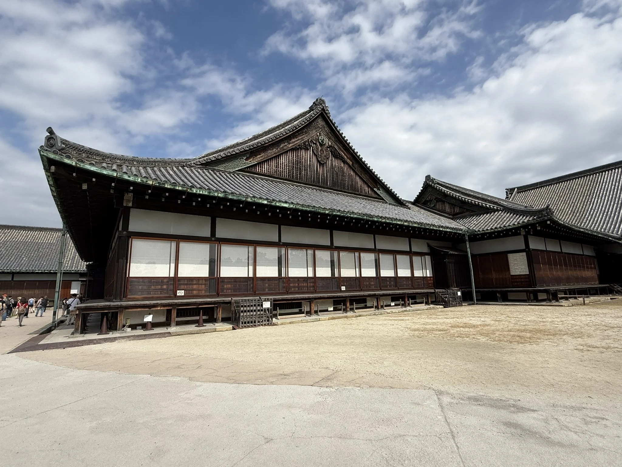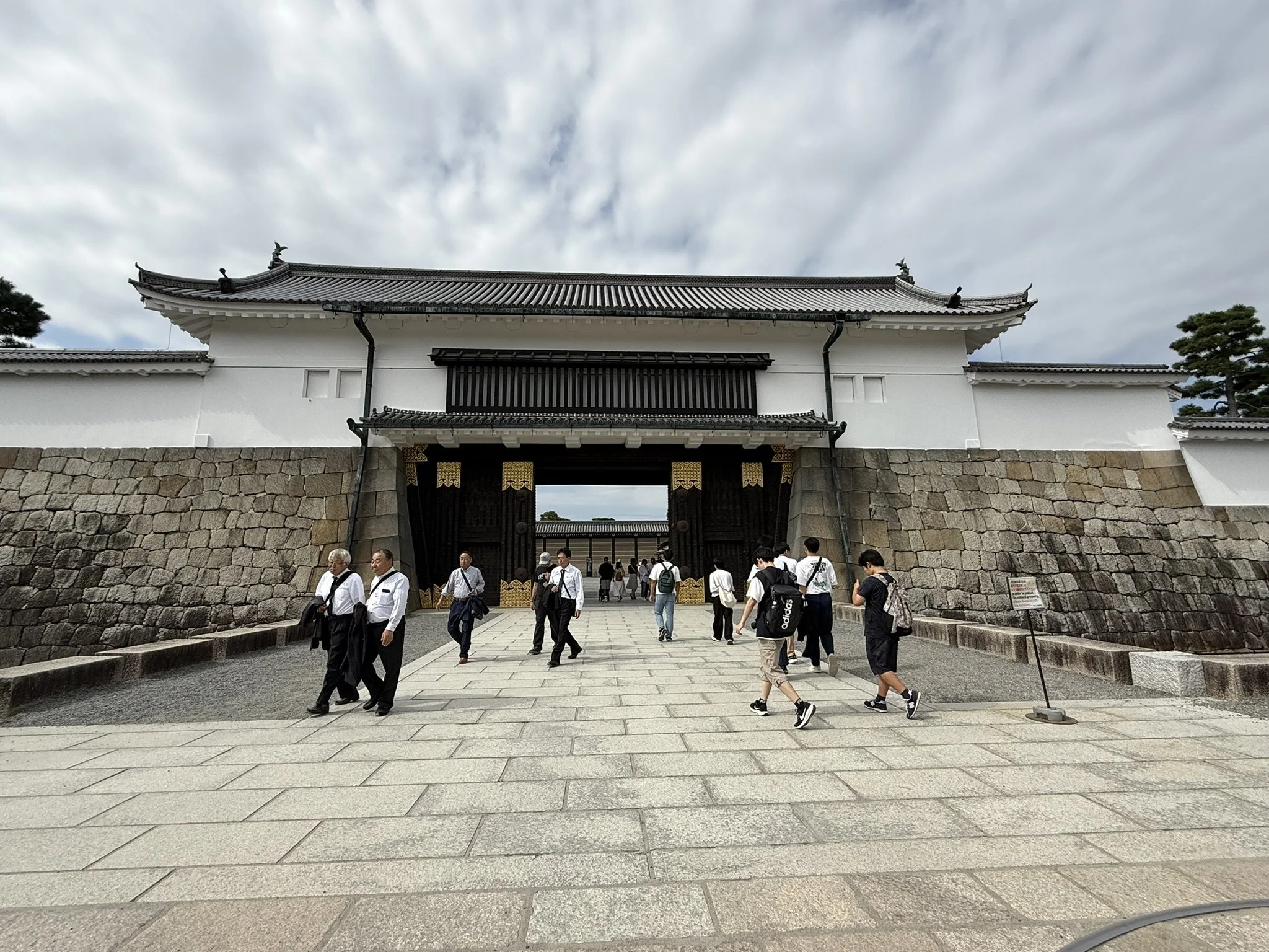 Our next stop was the Nijo-jo Castle, an UNESCO World Heritage Site that was completed in 1603 by the order of the first Shogun of the Tokugawa Shogunate, Tokugawa Ieyasu. The Castle was the residence of the Shogun while in Kyoto, or housed the Nijo Zaiban samurai guards when the Shogun was not present. The rule of the Imperial Court and the first samurai government was established in Kamakura in 1185 and political rule was taken over by the samurai. Since the head of the Kamakura samurai government was officially granted the title of Seii-Taishogun, this name was later abbreviated to Shogun. This is basically a very ancient court appointment dating back to the 8th century (like a commander-in-chief). While this started as a temporary appointment, it became a permanent position for the political ruler of Japan after 1192. We walked the many gardens and walked the Ninomaru-goten Palace. This palace consists of 6 connected buildings with intricate paintings between the rooms such as the Tozamurai (waiting room), the Shikidai (reception room), the Ohiroma San-no-ma (third room), the Ohiroma Ich-no-ma, Ni-no-ma (grand hall), the Kohiroma (small grand hall), Shiro-shoin (sitting room), Ohiroma Yon-no-ma (fourth room), Shikidai Roju-no-ma (senior counselor’s room), Tozamurai Chokushi-no-ma (messenger’s room) and Tozamurai Yanagi-no-ma (willow room). While these are not all originals, we were able to view the "Fourth Room of the Kuroshoin” as a special exhibition in a separate museum hall.