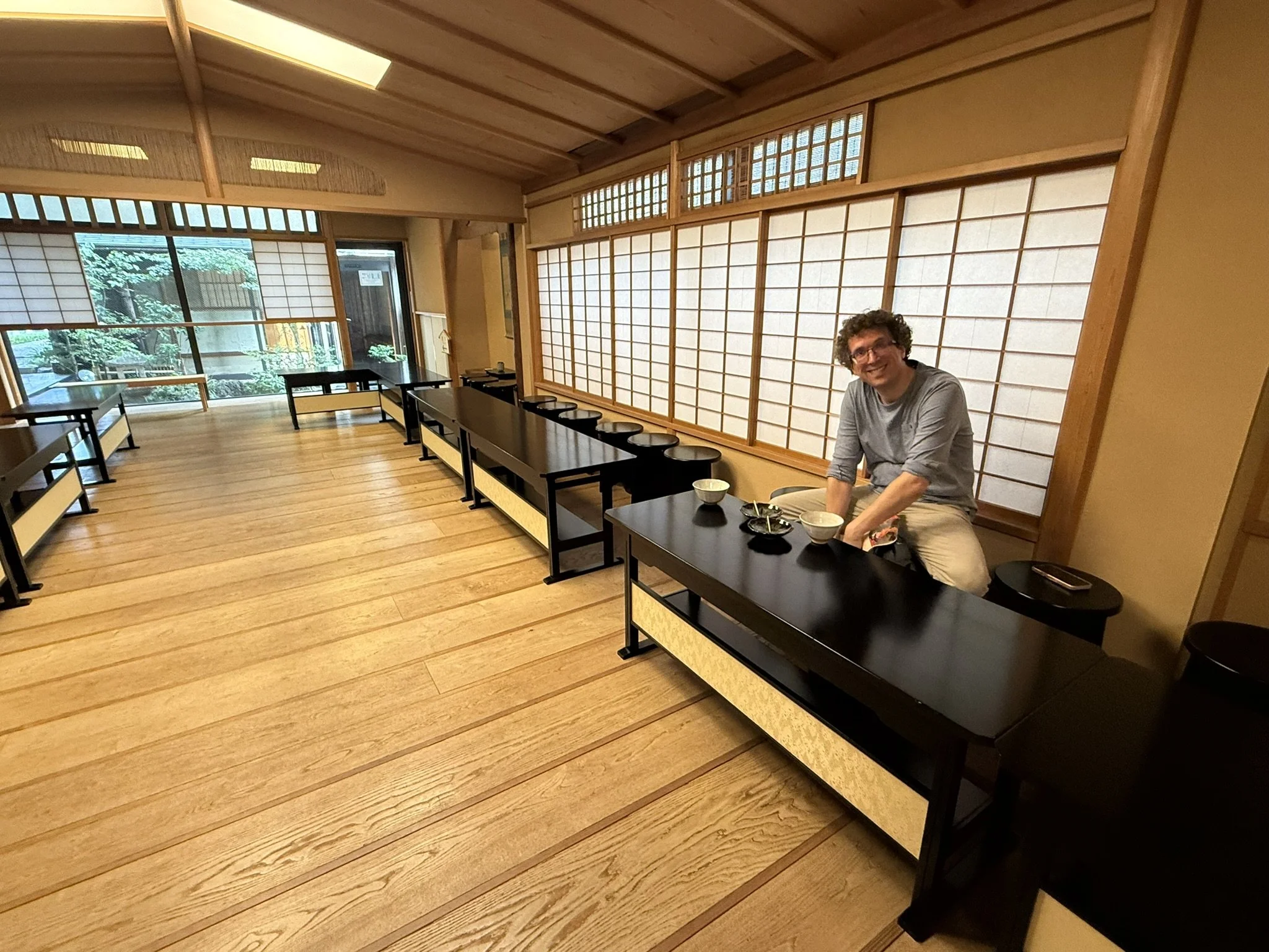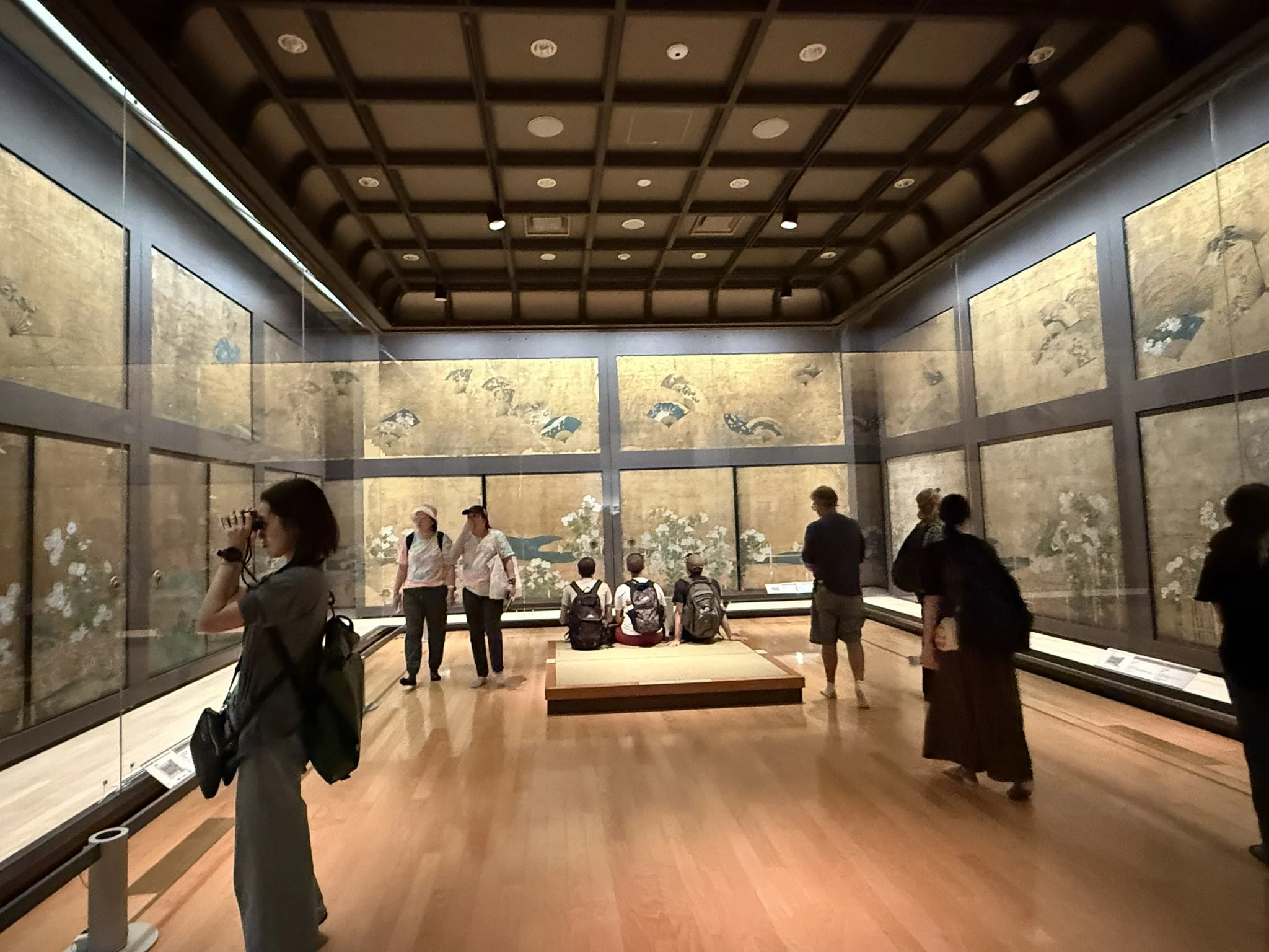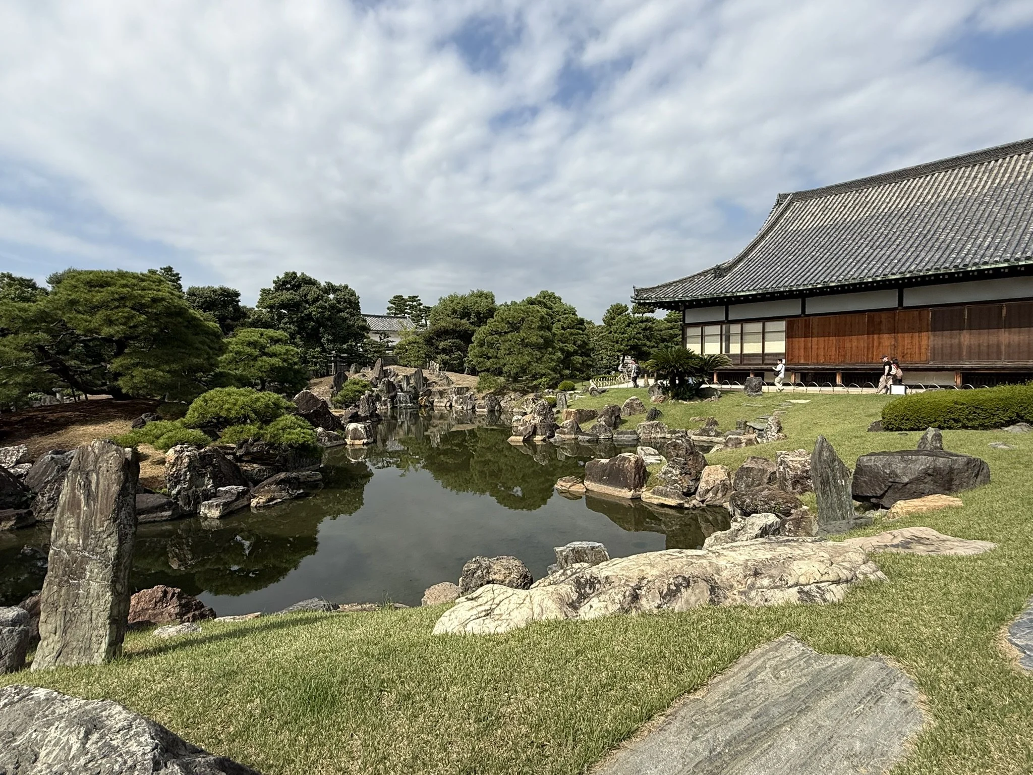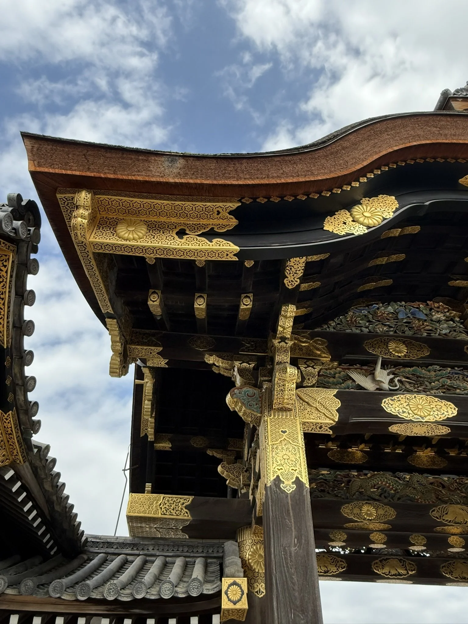 Our next stop was the Nijo-jo Castle, an UNESCO World Heritage Site that was completed in 1603 by the order of the first Shogun of the Tokugawa Shogunate, Tokugawa Ieyasu. The Castle was the residence of the Shogun while in Kyoto, or housed the Nijo Zaiban samurai guards when the Shogun was not present. The rule of the Imperial Court and the first samurai government was established in Kamakura in 1185 and political rule was taken over by the samurai. Since the head of the Kamakura samurai government was officially granted the title of Seii-Taishogun, this name was later abbreviated to Shogun. This is basically a very ancient court appointment dating back to the 8th century (like a commander-in-chief). While this started as a temporary appointment, it became a permanent position for the political ruler of Japan after 1192. We walked the many gardens and walked the Ninomaru-goten Palace. This palace consists of 6 connected buildings with intricate paintings between the rooms such as the Tozamurai (waiting room), the Shikidai (reception room), the Ohiroma San-no-ma (third room), the Ohiroma Ich-no-ma, Ni-no-ma (grand hall), the Kohiroma (small grand hall), Shiro-shoin (sitting room), Ohiroma Yon-no-ma (fourth room), Shikidai Roju-no-ma (senior counselor’s room), Tozamurai Chokushi-no-ma (messenger’s room) and Tozamurai Yanagi-no-ma (willow room). While these are not all originals, we were able to view the "Fourth Room of the Kuroshoin” as a special exhibition in a separate museum hall.