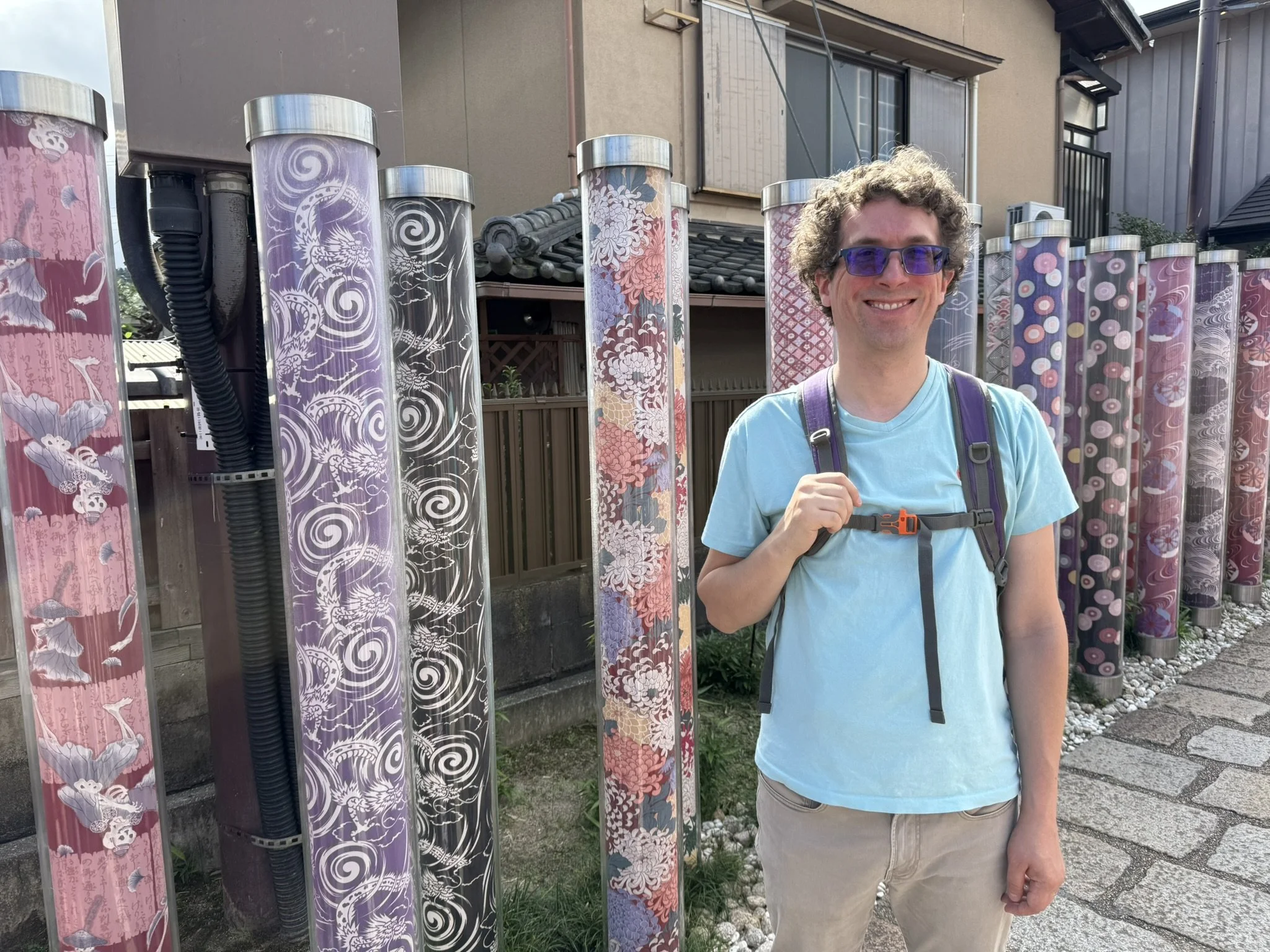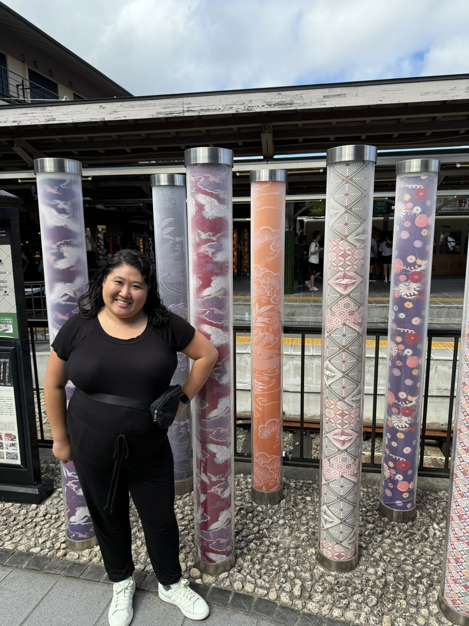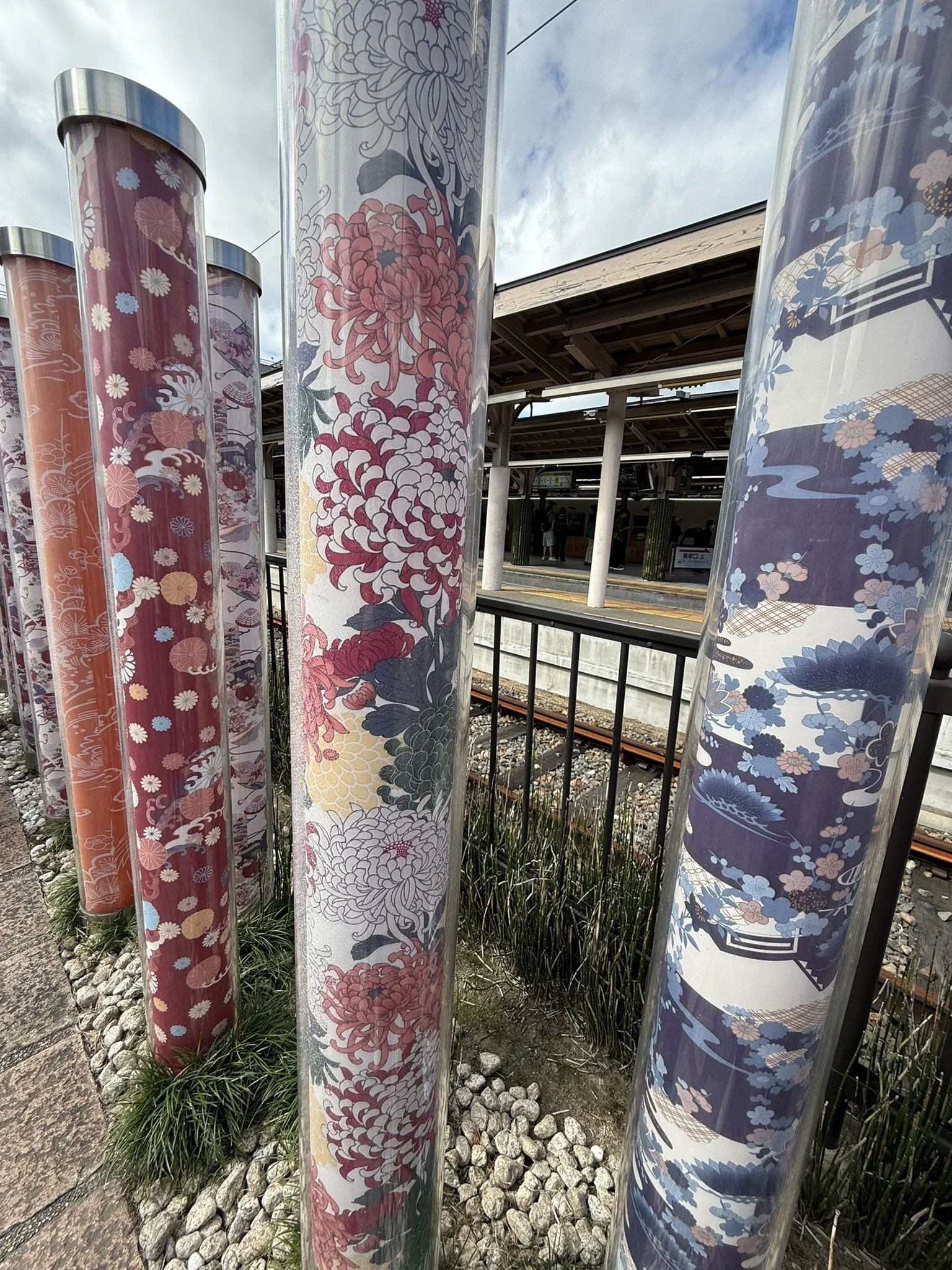 While walking back to the train station, we found the Kimono Forest, a permanent art installation that features 600 cylindrical poles that had 32 different patterns of fabric encased in acrylic poles. While we didn’t see them light up in the evening, it was still fun and colorful to walk the Kimono Forest path.