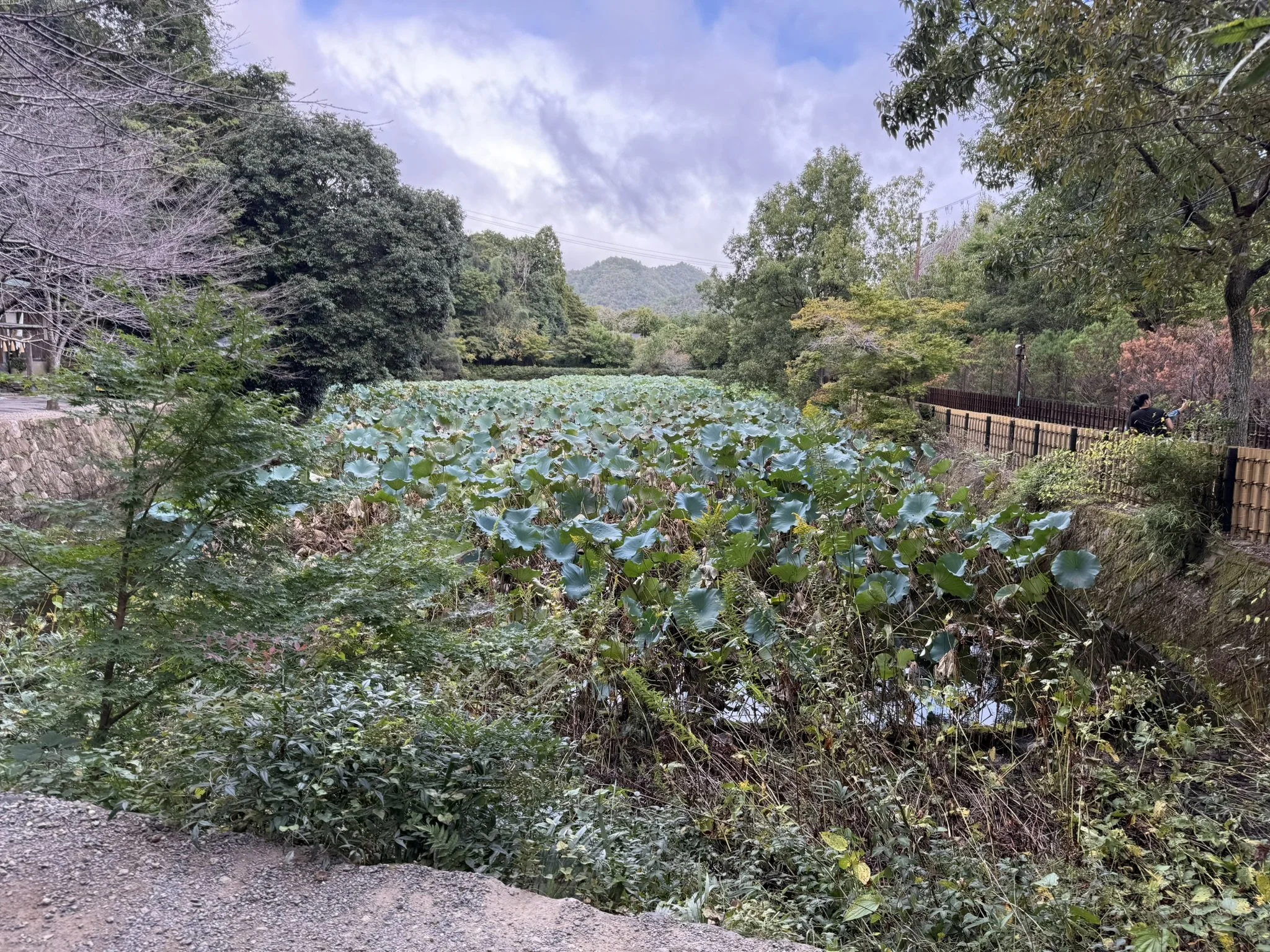 Kyle and Danielle were also up by 6:00am, so we walked to their hotel (they stayed at a different hotel a 5 minute walk away) and we got some pre-made food from 7-Eleven. I found this cold pasta salad that I really enjoyed that had vegetables, chicken, and a lemon/soy sauce dressing on it. It was so easy to buy pre-made food (hot and cold) from the 7-Elevens. We figured out the train station and bought a ticket to Arashiyama. Our first stop was the Arashiyama Bamboo Forest. The Bamboo Forest is about 6 square miles of walking paths but it only took about 30 minutes to walk the entire main path. We also walked by a large calm pond called the Okura-ike Pond. It was full of lotus (which apparently bloom in late July) and ducks if you looked close enough.